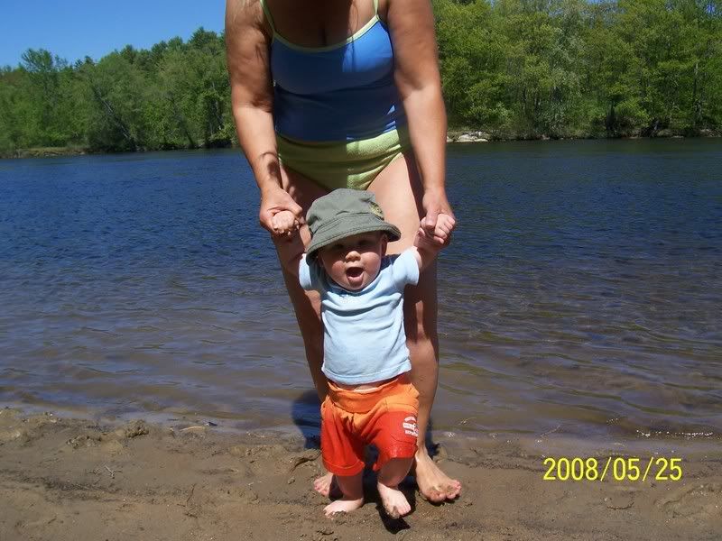 My great grandmother has a private beach on the Saco River and this past weekend me, my mom, Cam, and my aunt all went down to get some sun and see how much Cam loved the water. He thought it was the best thing. Here are some pics..