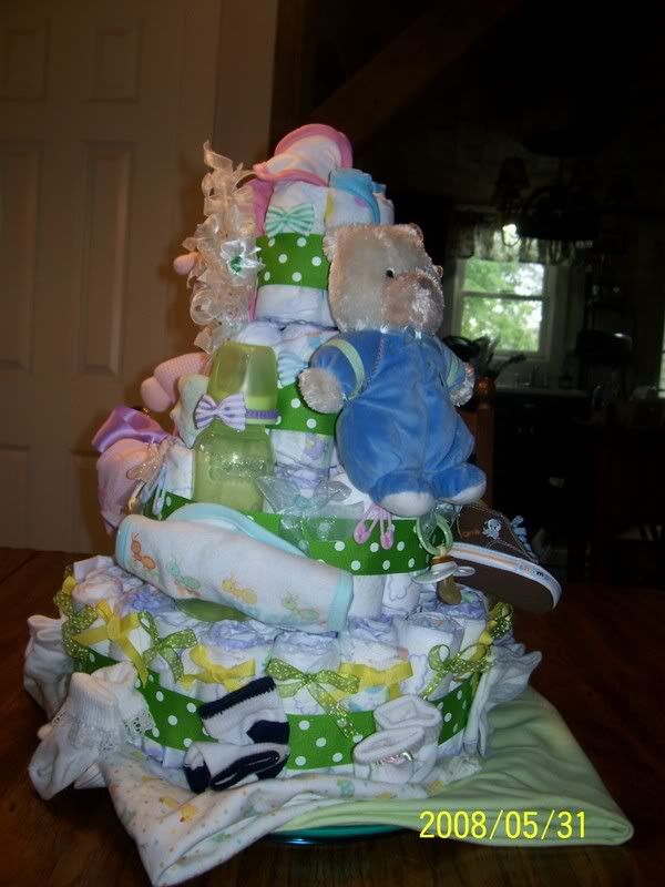 This is a picture of the first tier. Underneath the cake I did recieving blankets and then bordered the bottom with bows and socks. I alternated boy and girl socks. I wanted to keep the ribbons neutral so green and yellow it was!!